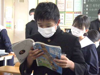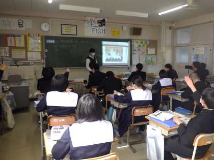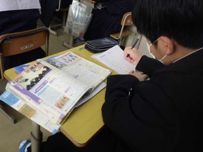 「明治維新」について学習していました。教科担任による映像を用いた解説を「人物プリント」や「学習プリント」などにどんどんメモしていきます。単に黒板に書かれたことをノートに写すという学習方法ではなく、措置の学習や振り返りで見やすいように、各自が工夫して学習の足跡を残しています。