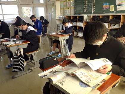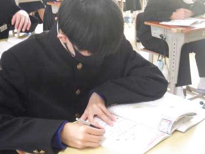 2日後に公立高校の一般入試を控えた生徒がほとんどであるため、入試直前の追い込み学習として、各自の弱点補充に取り組んでいました。これまでにも入試対策として、入試の極意が教科担任より伝授されてきています。不安な部分や心配事もあるとは思いますが、学習用タブレットやテキストなどをしっかりやり込み、本番に臨んでもらいたいと思います。