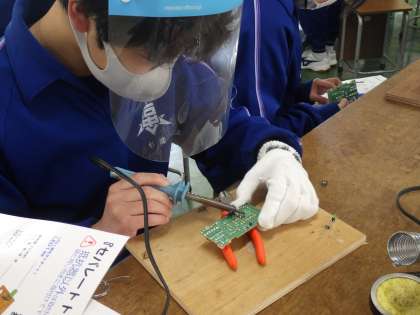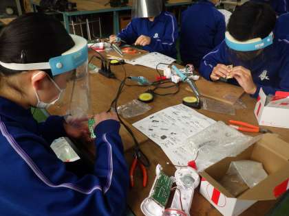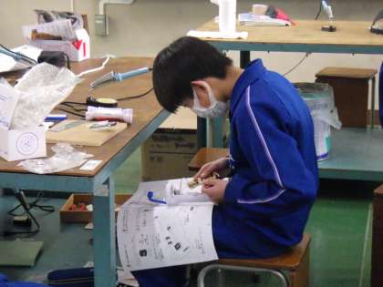 セパレート・トーチの製品づくりに取り組んでいました。設計図をよく見て、取り付けるべき細かな部品を確認していきます。はんだごてやニッパー、ラジオペンチ、ドライバーなど、使用する道具も増えてきて、その使い方も様になってきています。