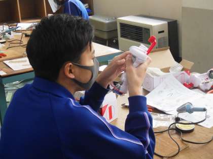 セパレート・トーチの製品づくりに取り組んでいました。設計図をよく見て、取り付けるべき細かな部品を確認していきます。はんだごてやニッパー、ラジオペンチ、ドライバーなど、使用する道具も増えてきて、その使い方も様になってきています。