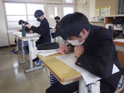本日実施される公立高校の一般入試に備え、最後の追い込みです。不安を自信に変えるため、過去問やテキストの問題を解いていました。