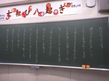 連日のように書かれている1年生の担任による黒板メッセージ。卒業を祝う会に向け、3年生への感謝を形にすることだけでなく、こういう時こそ、周りをよく見て行動・生活することの大切さを訴えかけています。