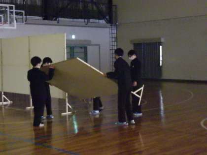 会場の装飾担当は、装飾品づくりにめどが立ち、会場に衝立を運び始めていました。また、舞台発表の担当も、監督(担当教師)のストップがかからなくなり、ずいぶんスムーズに演技できるようになってきました。