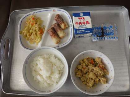 今日の献立は、高野豆腐の卵とじ、切干しだいこんのごま酢あえ、ちくわの天ぷら、ごはん、牛乳 でした。 エネルギー:912kcal