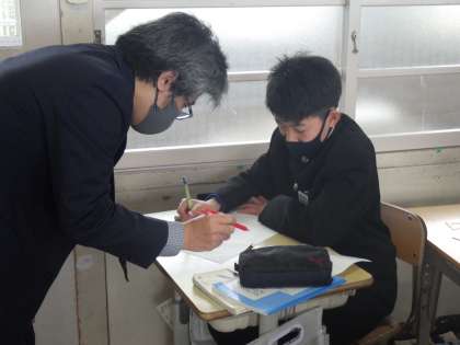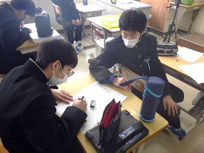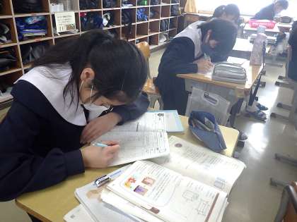 プリントやテキストなどを使って、年間の総復習に取り組んでいました。仲間や教科担任にも相談しながら進めていました。新しい学年に気持ちよく進むため、時間いっぱい、一生懸命取り組んでいました。