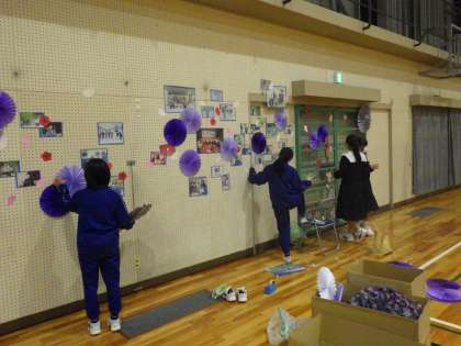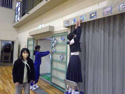 会場装飾の担当が、これまで苦労してるくり続けてきた掲示物を丁寧に貼りつけています。舞台発表の担当は、衣装を着けて本番どおりのリハーサル、映像担当は、出来上がった映像の動作チェックを行っています。