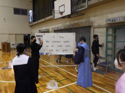 会場装飾の担当が、これまで苦労してるくり続けてきた掲示物を丁寧に貼りつけています。舞台発表の担当は、衣装を着けて本番どおりのリハーサル、映像担当は、出来上がった映像の動作チェックを行っています。