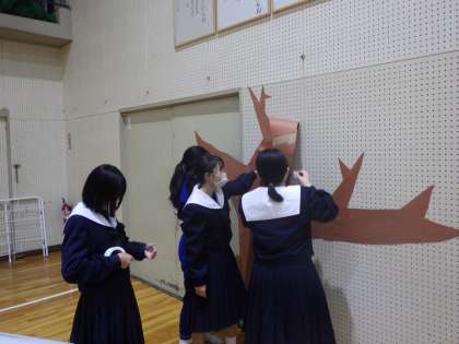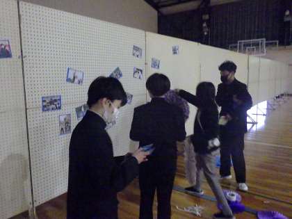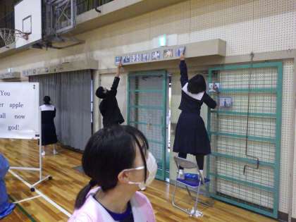会場装飾の担当が、これまで苦労してるくり続けてきた掲示物を丁寧に貼りつけています。舞台発表の担当は、衣装を着けて本番どおりのリハーサル、映像担当は、出来上がった映像の動作チェックを行っています。