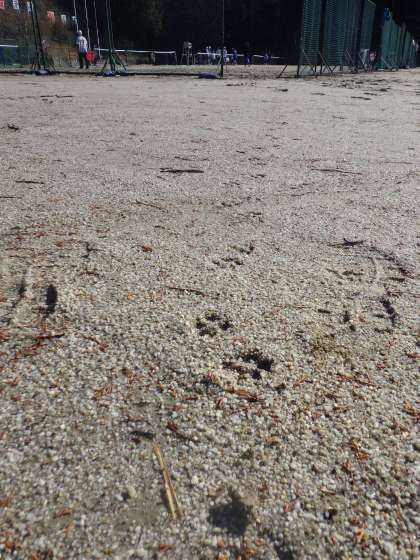 校内でしばしば目にする動物たちの足跡。写真は、テニスコートの生徒たちの出入りする防球ネットの間から続く足跡です。辺りを荒らすことなく一直線に続く足跡から、わきまえた(?)動物たちの行動に少し心が洗われます。
