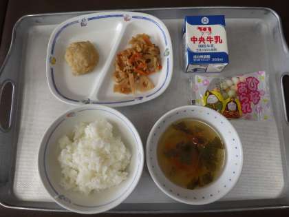 今日は「ひなまつり献立」ということで、すまし汁、ちらしずし、豆腐ハンバーグ、ひなあられ、牛乳 でした。 エネルギー:788kcal