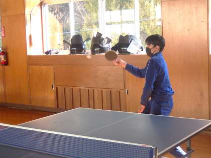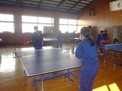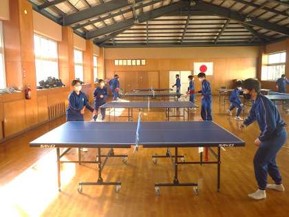 祝う会の準備が進み、体育館が使用できないこの時期は、武道場での卓球で汗を流します。公立高校一般入試を終え、久しぶりに仲間がそろった今日。全員と総当たりのゲームにはりきって活動している様子が印象的でした。