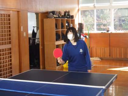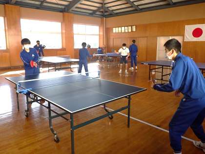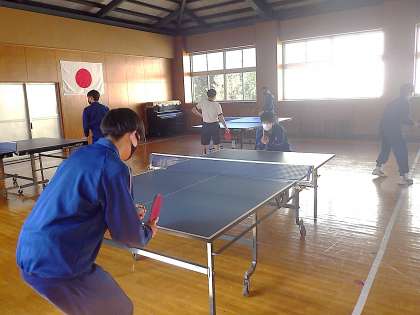 祝う会の準備が進み、体育館が使用できないこの時期は、武道場での卓球で汗を流します。公立高校一般入試を終え、久しぶりに仲間がそろった今日。全員と総当たりのゲームにはりきって活動している様子が印象的でした。