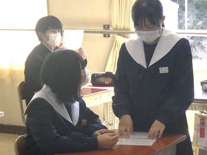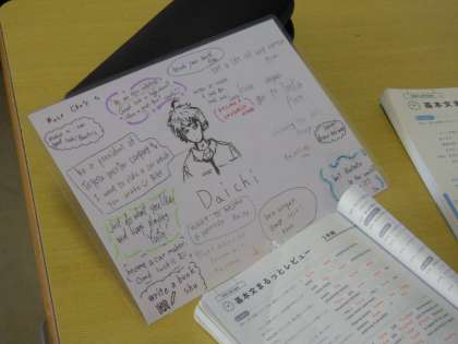 以前学習した文法を使って、仲間へメッセージを書き込んだものが完成し、本人の手に渡されました。英文で書かれた「将来〜してそう」を一つ一つ解読していきます。意味が伝わりにくいものは、直接仲間に確認をしに行きます。
