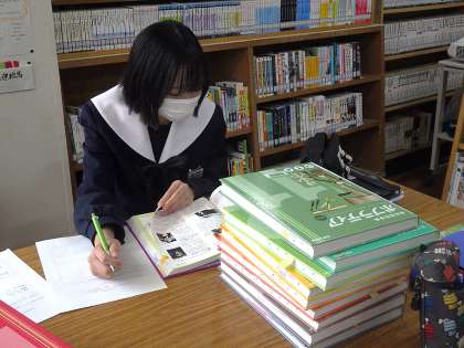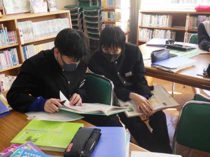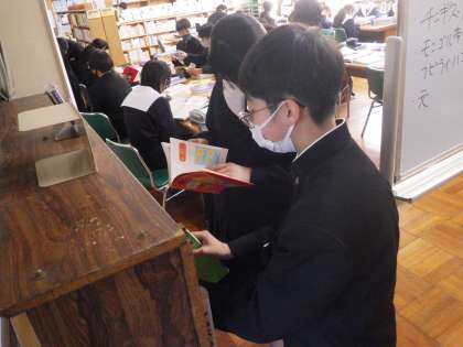 図書館での調べ学習が行われていました。気になったキーワードを見つけ、そこから自分で調べるためのテーマを決めていきます。