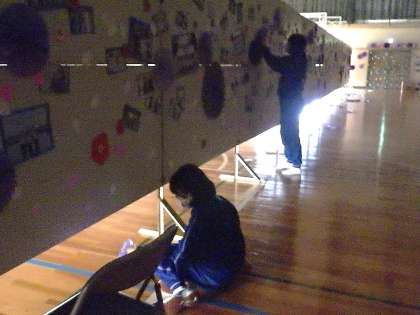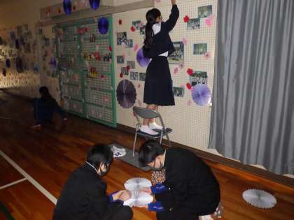 各担当に分かれ活動してきたスタッフ活動。明日の本番を前に最後のまとまった時間での活動です。舞台発表も会場の装飾も最後の微調整に入っていました。写真で見てきた部分も、生で見ると迫力や細かさなどが伝わってくると思います。また、写真では表せない音声の部分も、3年生には期待してほしいと思います。