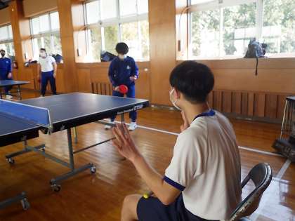 3人グレープを作り、総当たりの対戦です。勝てば奥の卓球台、負けると手前の卓球台へと移動が決まります。楽しみながらも、真剣にゲームに臨んでいました。