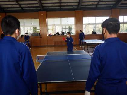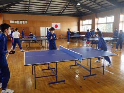 3人グレープを作り、総当たりの対戦です。勝てば奥の卓球台、負けると手前の卓球台へと移動が決まります。楽しみながらも、真剣にゲームに臨んでいました。