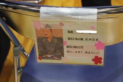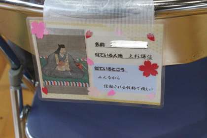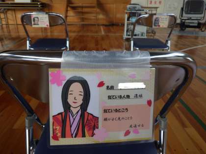会場の装飾がすべて整い、3年生の入場を待ちます。3年生の座席には、イメージする歴史上の人物とコメントの入った座席カードが貼ってあります。