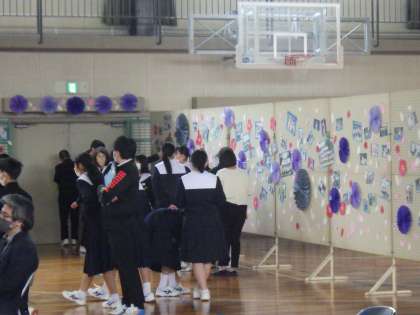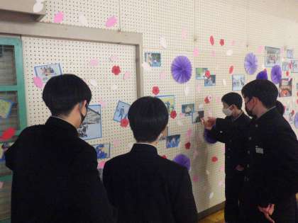休憩に入り、後輩たちが作成した会場装飾・思い出の写真の数々を懐かしげに見ています。また、1・2年生も会場装飾担当のスタッフたちの頑張りを肌で感じているようです。