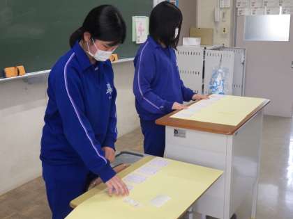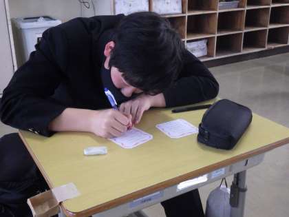 後輩たちによって中学校での思い出がまた一つ増えた3年生。祝う会が終了して教室に戻ると、さっそくお礼のメッセージを後輩たちに書いていました。