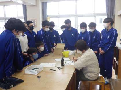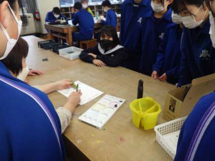 「絵手紙で春のメッセージを描こう」をテーマに作品づくりに取り組んでいました。教科担任が用意した様々な素材から、自分の作品のイメージに合うものを選び、絵手紙を作成していきます。