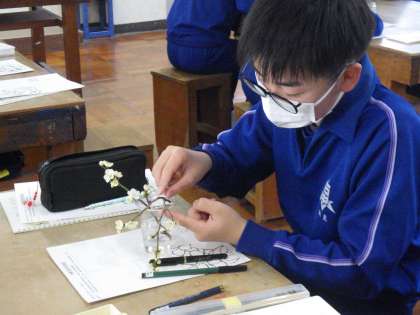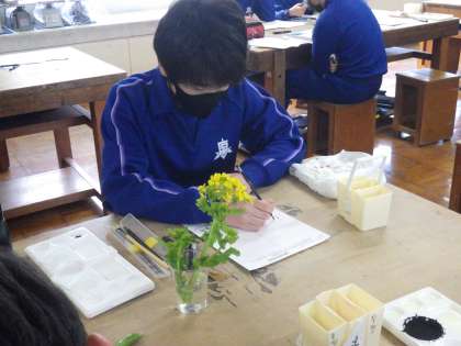 「絵手紙で春のメッセージを描こう」をテーマに作品づくりに取り組んでいました。教科担任が用意した様々な素材から、自分の作品のイメージに合うものを選び、絵手紙を作成していきます。