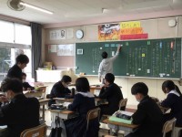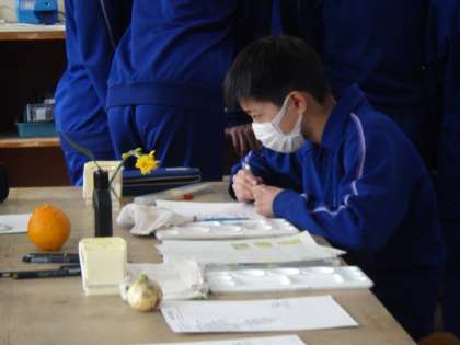 「絵手紙で春のメッセージを描こう」をテーマに作品づくりに取り組んでいました。教科担任が用意した様々な素材から、自分の作品のイメージに合うものを選び、絵手紙を作成していきます。