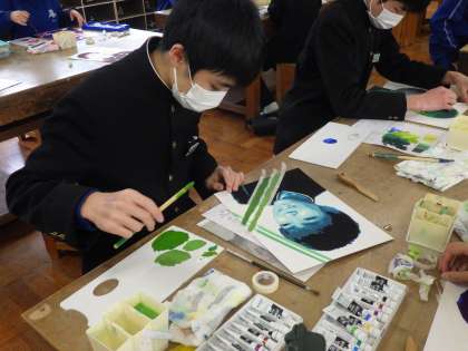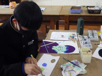 明暗分割技法を使った自画像イラストの作品づくりに取り組んでいました。ただ、本日が中学校最後の授業。これまで丁寧に作品づくりに取り組んできたおかげで、全員が納得のいく作品として完成しました。