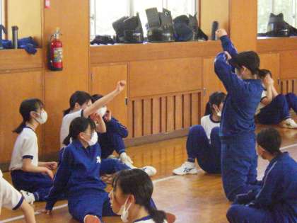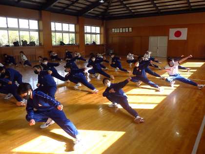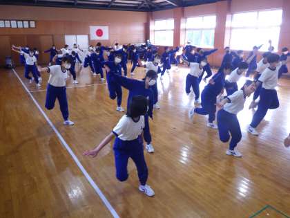 6時間目、1・2年生が合同で石中ソーランの練習に取り組んでいました。卒業式後の門送りの前に3年生に披露するためです。