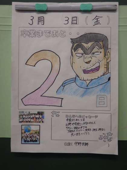 3年生の教室に掲示されている「卒業までのカウントダウンカレンダー」。