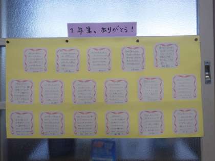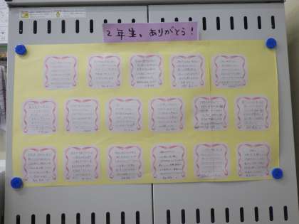 1・2年生のそれぞれの教室に、3年生からのお礼のメッセージが掲示されていました。楽しい時間を過ごさせてもらった『卒業を祝う会』についてのお礼です。