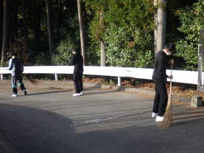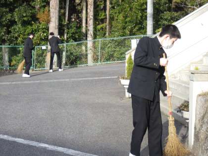 朝から、竹ほうきで掃く音が聞こえてきます。それも複数。登校してきた3年生が続々とあいさつの坂道に集まり、掃除を始めていました。