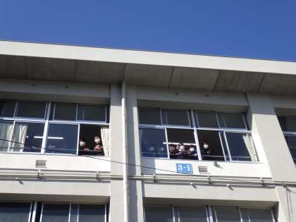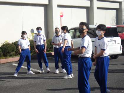 表彰式が予定より早く終わったため、1・2年生が門送りソーラン隊形の確認をするためにロータリーに移動してきました。