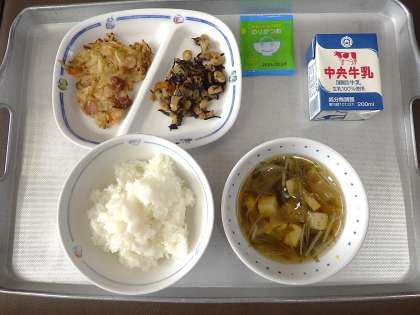今日の献立は、はりはり汁、ひじきの炒め煮、わんぱくじゃこ天、ごはん、ふりかけ(のりかつお)、牛乳 でした。 エネルギー:797kcal