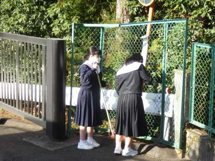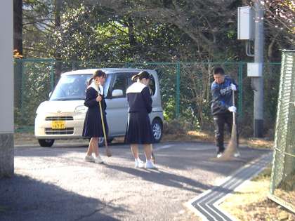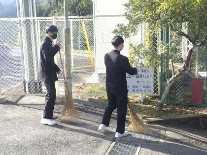 8時前、正門付近から聞こえてきたのは竹ぼうきで掃く音。やはり3年生でした。