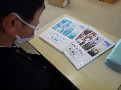 卒業式前の最後の学活となった3年生。待ちに待った卒業アルバム・文集が配付され、懐かしそうに眺めていました。