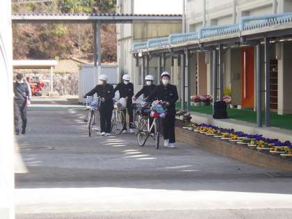 アルバム・文集、通知表を受け取り、中学校3年間でのすべての活動を終えた3年生。通学段ごとの下校の様子を見られるのもこれが最後です。