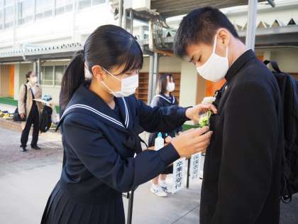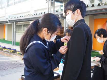 受付を済ませ、後輩に胸花をつけてもらっている3年生の緊張の様子が伝わってきます。