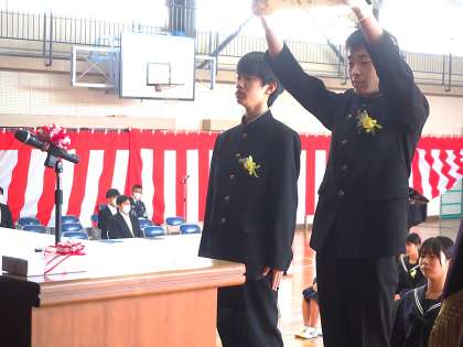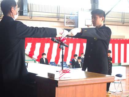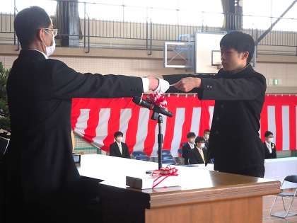 校長先生より、卒業証書の授与が行われています。一人一人が担任の呼名に対して元気よく返事をしています。受け取る姿も真剣で凛々しい!