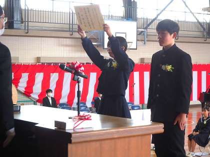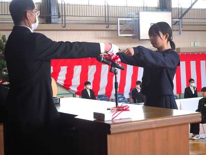校長先生より、卒業証書の授与が行われています。一人一人が担任の呼名に対して元気よく返事をしています。受け取る姿も真剣で凛々しい!