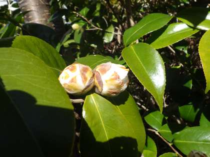 昨日も紹介した正門ロータリーの築山のツバキ。鮮やかな赤色で咲いた花の横には、白色の蕾がありました。