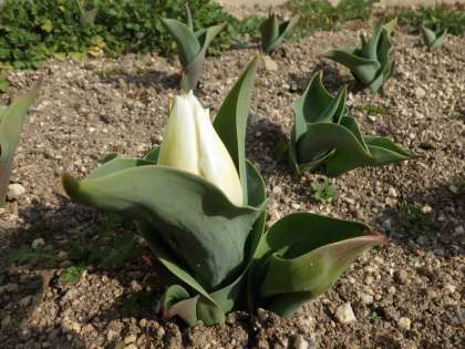 これまでにも紹介してきた体育館南側花壇のチューリップ。ようやく目を出し始めたと思ったらぐんぐん成長し、昨日、一番蕾を発見しました。今後は他のチューリップたちも蕾を見せ、どんな色の花が咲くかが確認できるようになります。暖かさが増すころ、きれいな花がたくさん目にできそうで、本当に楽しみです。