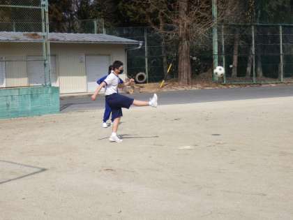 昨日に引き続き絶好のの天気のもと、運動場で行われたこの授業。仲間同士で声援を送り合いながら、楽しそうにプレーしていました。