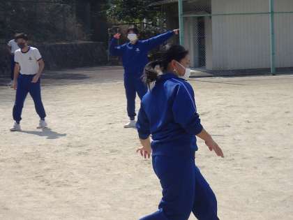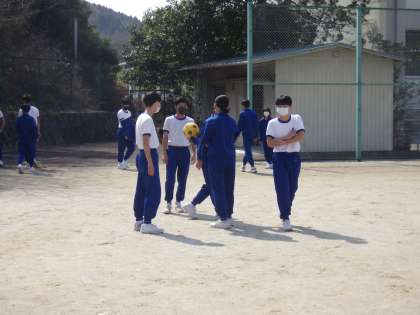 昨日に引き続き絶好のの天気のもと、運動場で行われたこの授業。仲間同士で声援を送り合いながら、楽しそうにプレーしていました。