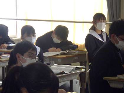 過去形と過去進行形のまとめに取り組んでいました。その後、次回の最後の単元の学習予告がされました。長文の暗記です。生徒たちは声をあげていましたが、先輩たちも挑戦してきたことを知り、一生懸命取り組もうという気持ちに切り替わったようです。
