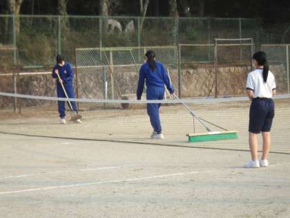 帰りの会が終わるとすぐにテニスコートに集まってきます。ボールやネットの準備、コートのライン引きなども手際よく済ませます。短い時間も目いっぱい活動。そして、下校に間に合うよう、片付けの動きも非常に強力的…。