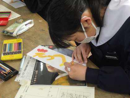 最初に、次回の作品づくりで使用する彫刻刀の確認が行われていました。その後、これまでの「オノマトペ」の作品づくりで、いよいよ最後の仕上げに入っていました。丁寧に色を塗り、立体的に見せるなどの工夫をしている様子から、自分の作品の相当の思い入れがあるように感じ取れました。