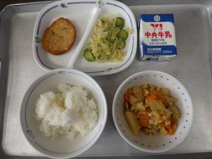 今日の献立は、親子煮、たくあんあえ、キャベツ入りはんぺん、ごはん、牛乳 でした。 エネルギー:767kcal
