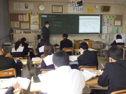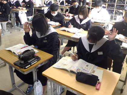 今日はグループの隊形を横3人組とし、活動にも変化を持たせています。細かく出題される発問に生徒たちも相談をしながら、挙手をして確認できたことをアピールしていました。