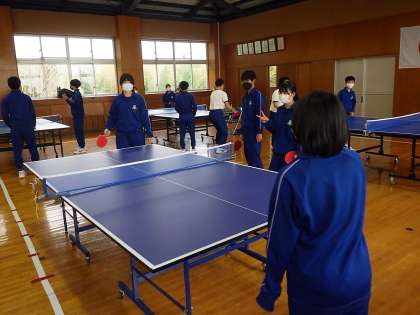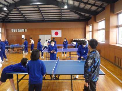 試合会場そのものがトーナメントになっていて、勝てば勝者の卓球台へ、負ければ敗者の卓球台に進んでいきます。1台に4名がつどい、総当たりで対戦していきます。